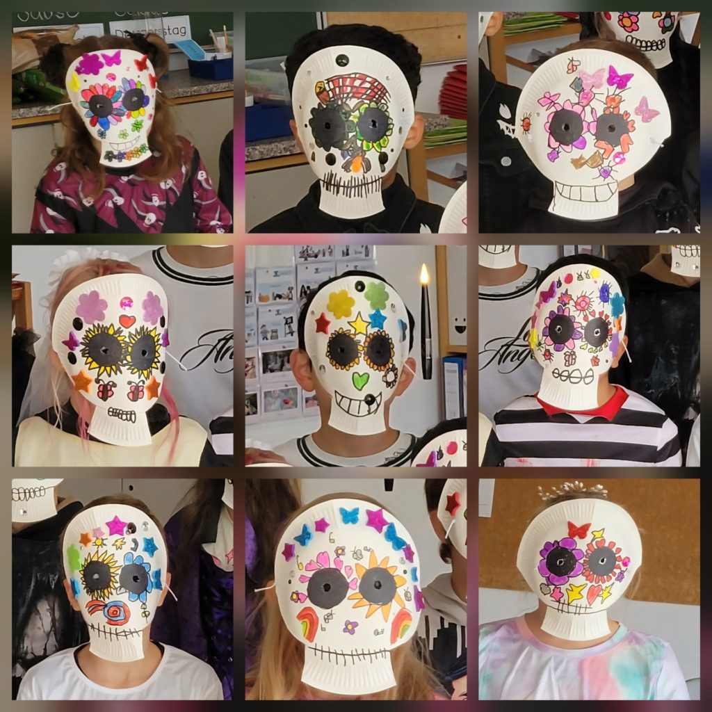 Kurz vor den Herbstferien wurde in der 2. Klasse Halloween gefeiert. Aus Papptellern haben die Kinder Totenköpfe ausgeschnitten. Mit bunter Farbe und glitzernden Aufklebern wurden daraus „sugar skulls“. Diese schön geschmückten Totenköpfe sind ein Brauch aus Mexiko. Am Tag der Toten gedenkt man so dort der Verstorbenen.